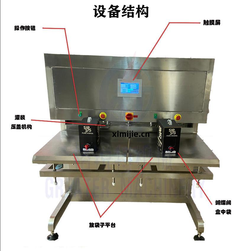 自動雙頭盒(he)中袋灌(guan)裝機(ji)主要(yao)適(shi)合於軟袋無(wu)菌灌(guan)裝,適(shi)合於紅酒、葡萄酒、牛(niu)奶(nai)等定(ding)量(liang)灌(guan)裝。