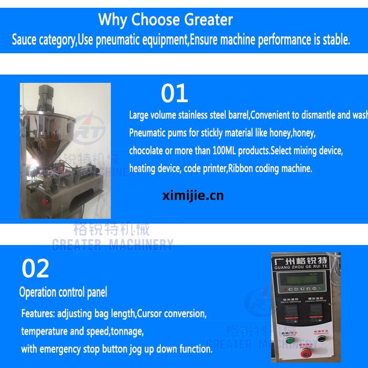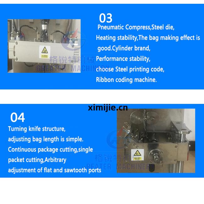 1. This machine can finish these work automatically: measuring--making bag--coding (option)--filling--gas injection(option)--sealing--counting.